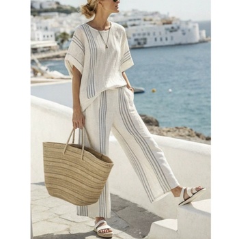 Conjunto de dos piezas con estampado de rayas informales, Jersey de manga de medio cuarto con cuello redondo holgado, conjunto de pantalones de pierna ancha, Moda de Primavera para mujer, novedad