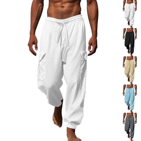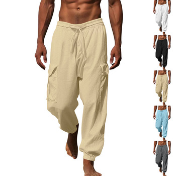 पुरुषों की गर्मियों और शरद ऋतु आकस्मिक पैर बंडल मल्टी पॉकेट टेथर ठोस रंग ढीले बड़े आकार के काम पैंट पुरुषों