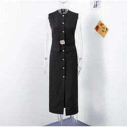 Elegante Único Breasted Tanque Vestido Mulheres Cintos Sem Mangas O-pescoço Magro Sólido 2025 Primavera Vestidos Comutar Rua Split Lady Robe